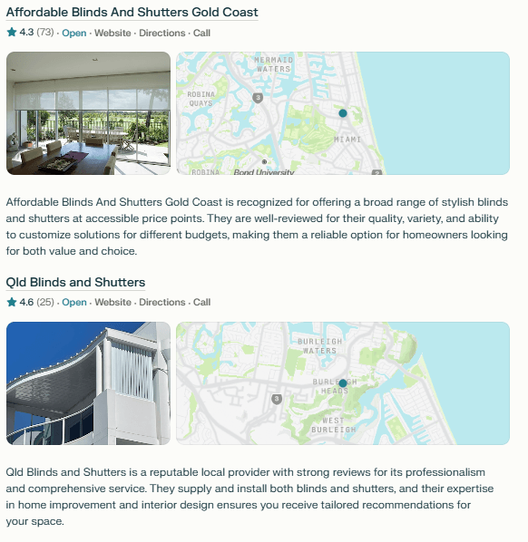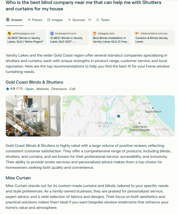 Local & Industry Domain Focus | Strong emphasis on local (.com.au, .gov.au, etc.) and region-specific sources; references industry-specific domains slightly more than Google 6. | Also prioritises local domains for location-based searches; strong in mapping and business listings 6. | Less local domain focus; depends on web search integration and may be less precise for hyperlocal queries 6. |