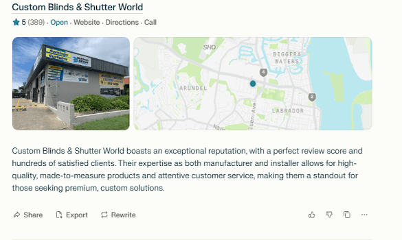 Review & Ranking Signals | Considers online reviews, third-party rankings, and citations from trusted sites; less influenced by SEO manipulation 256. | Heavily influenced by SEO: keywords, backlinks, content optimisation, and business profile completeness; reviews from Google Maps/Business 235. | Relies on reviews and rankings found in search results, but may not weigh them as systematically as Google or Perplexity 68. |